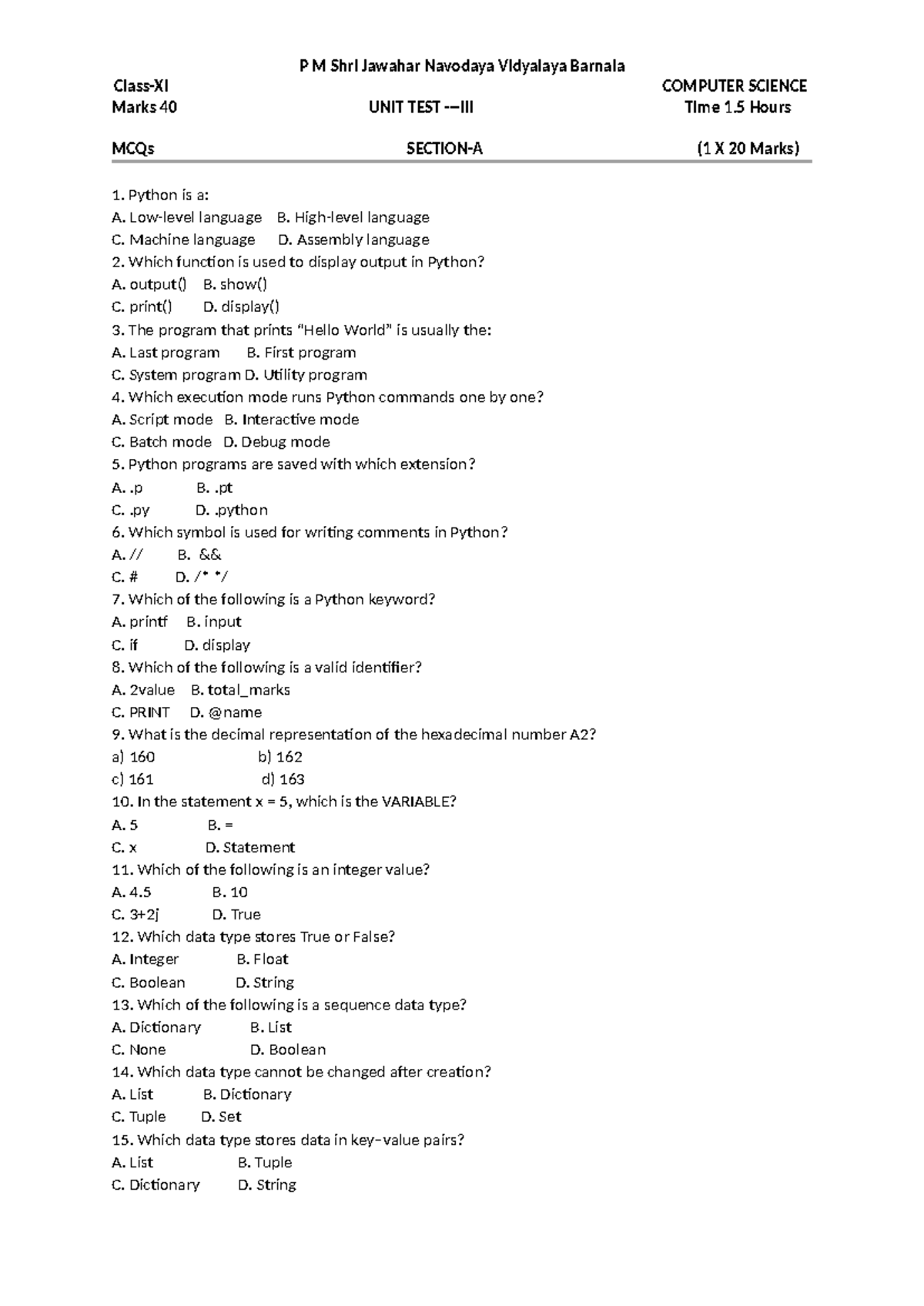 CS11 Unit Test: 40 MCQs on Python Programming - Studocu