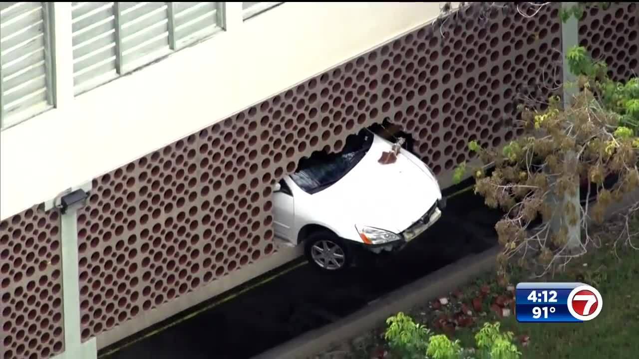 Car hangs off building after driver crashes through 2nd floor wall at ...