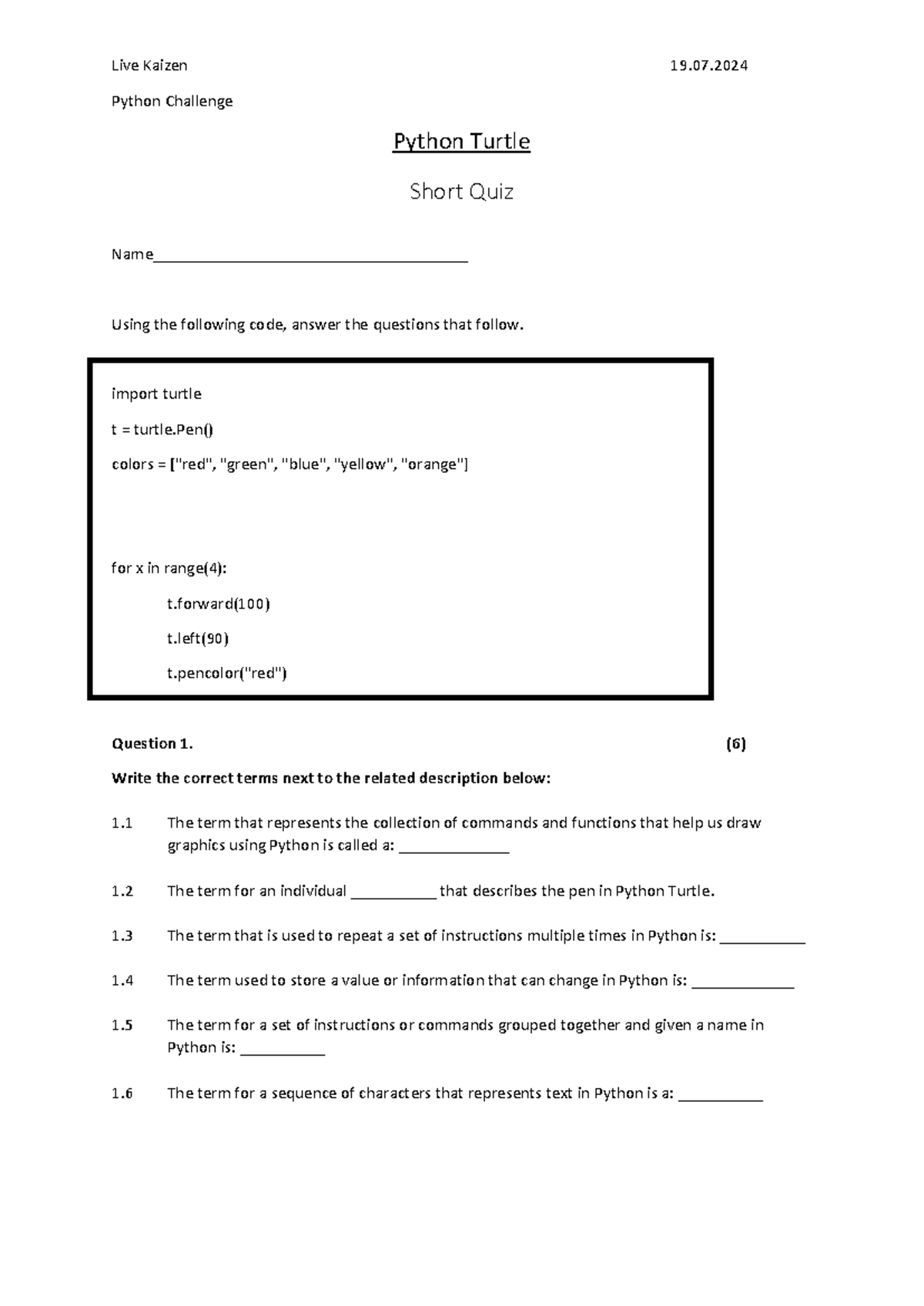 Short Quiz on Python Turtle (PYTHON 101) - Live Kaizen 2024 - Studocu