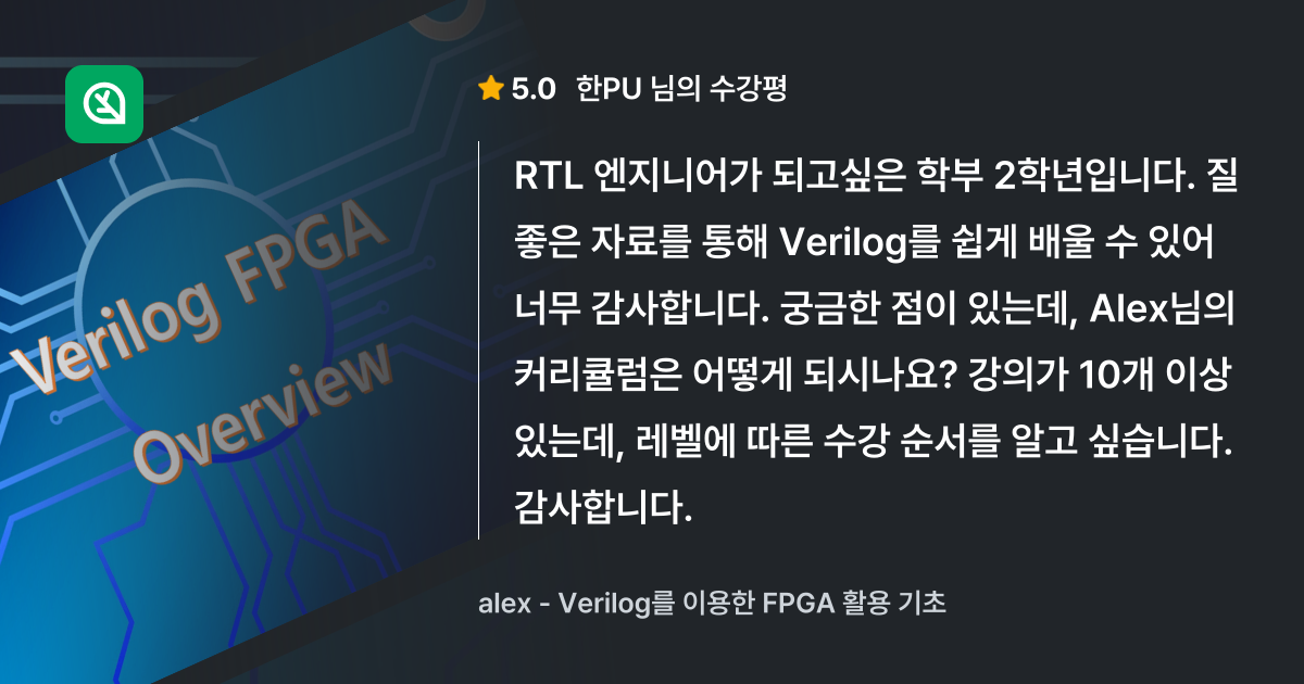 한PU님의 생생한 수강평, Verilog를 이용한 FPGA 활용 기초 - 인프런 | 수강평