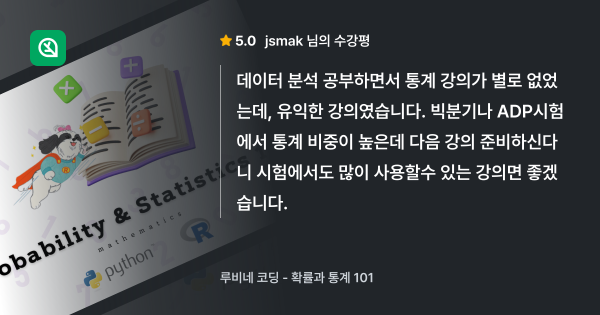 jsmak님의 생생한 수강평, 확률과 통계 101 - 인프런 | 수강평