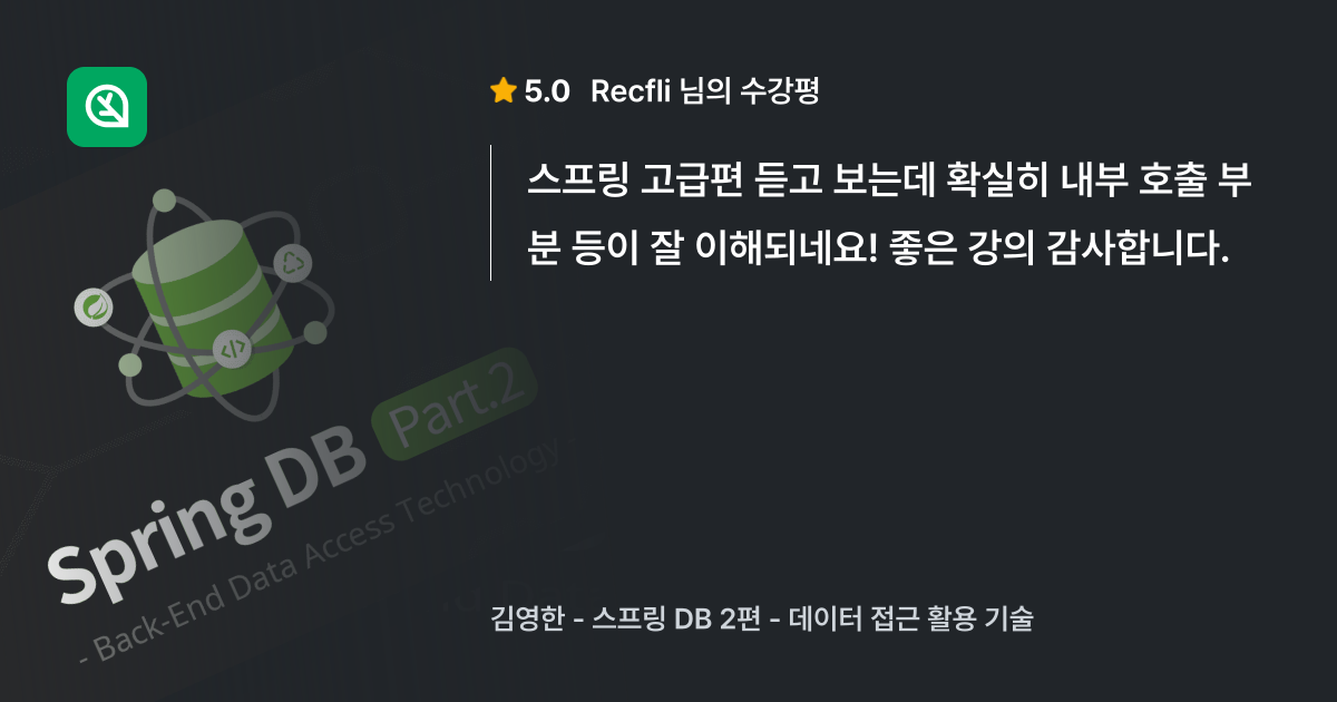 Recfli님의 생생한 수강평, 스프링 DB 2편 - 데이터 접근 활용 기술 - 인프런 | 수강평