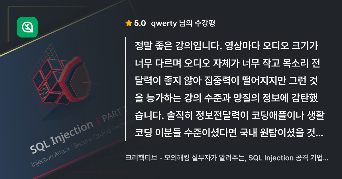 qwerty님의 생생한 수강평, 모의해킹 실무자가 알려주는, SQL Injec... - 인프런 | 수강평