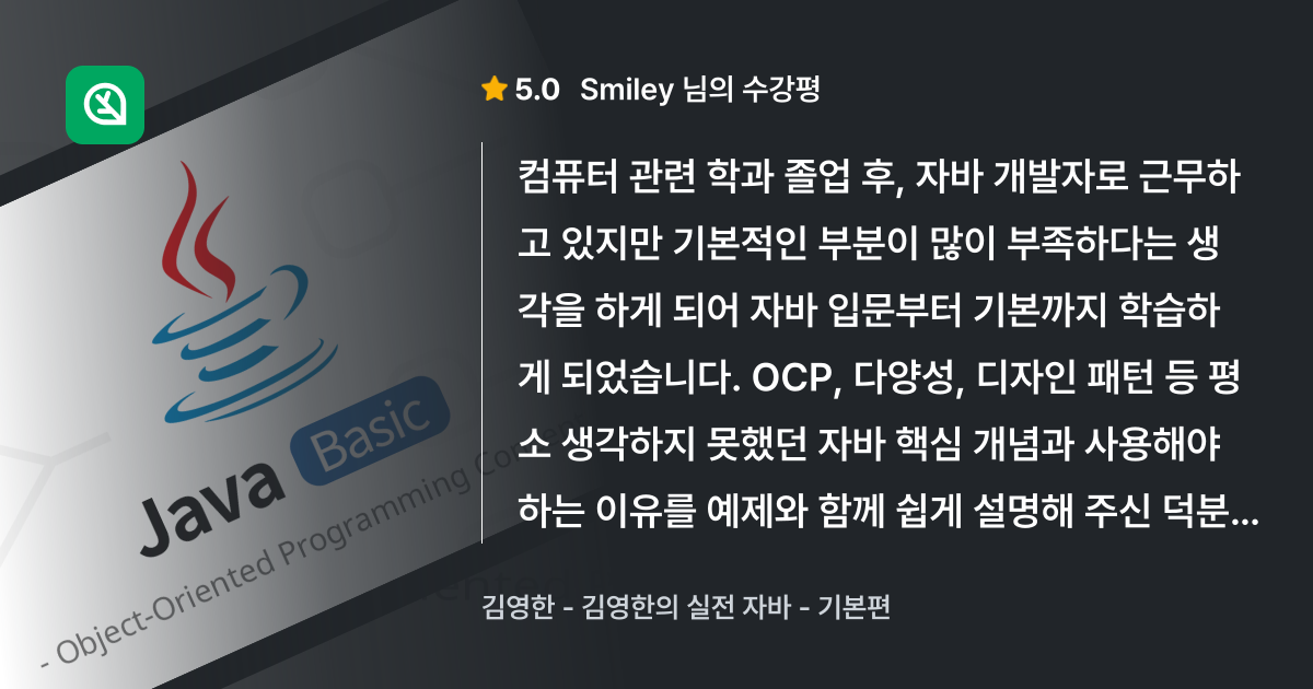 Smiley님의 생생한 수강평, 김영한의 실전 자바 - 기본편 - 인프런 | 수강평