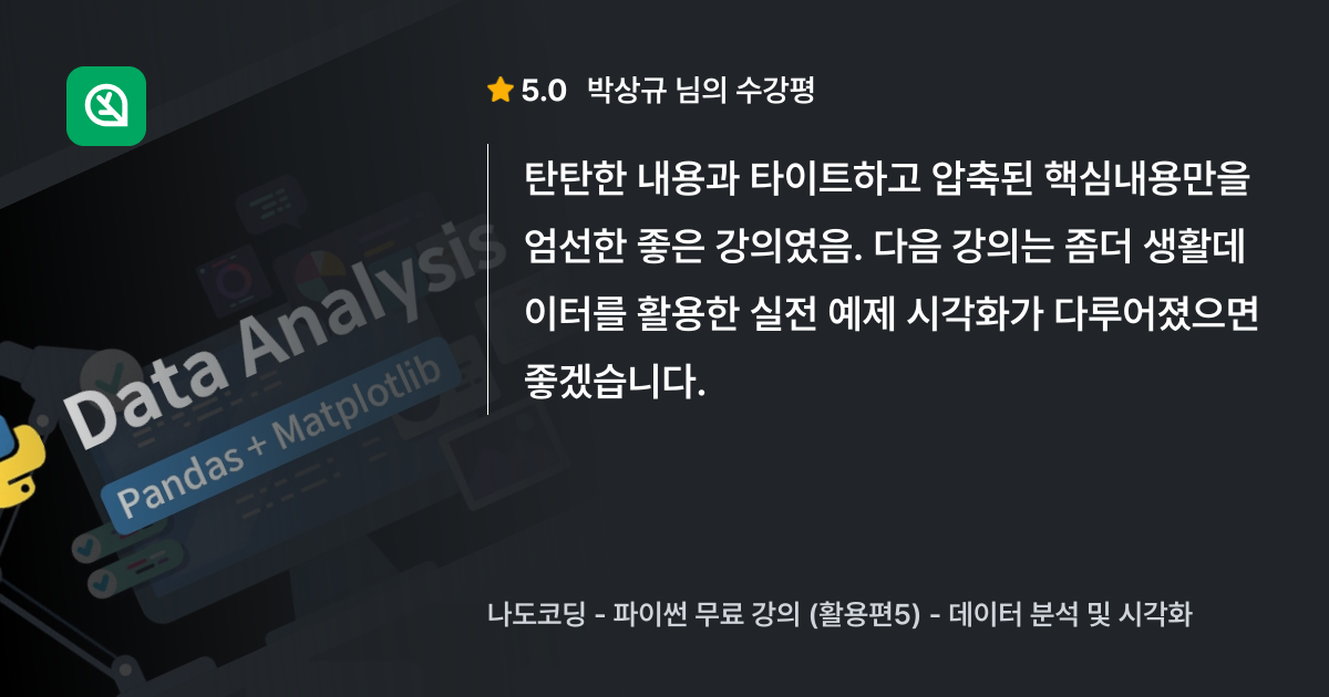 박상규님의 생생한 수강평, 파이썬 무료 강의 (활용편5) - 데이터 분석 및 ... - 인프런 | 수강평