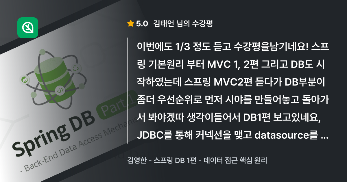 김태언님의 생생한 수강평, 스프링 DB 1편 - 데이터 접근 핵심 원리 - 인프런 | 수강평