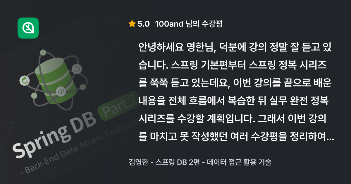 100and님의 생생한 수강평, 스프링 DB 2편 - 데이터 접근 활용 기술 - 인프런 | 수강평