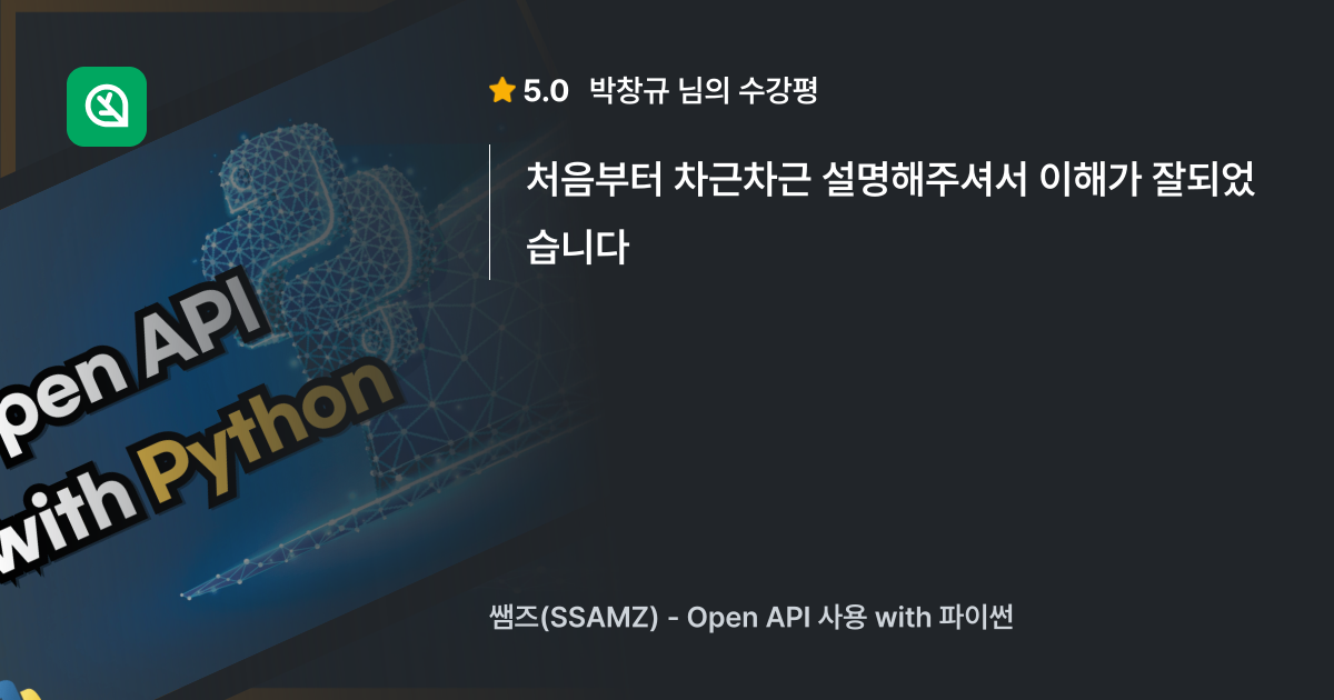 박창규님의 생생한 수강평, Open API 사용 with 파이썬 - 인프런 | 수강평