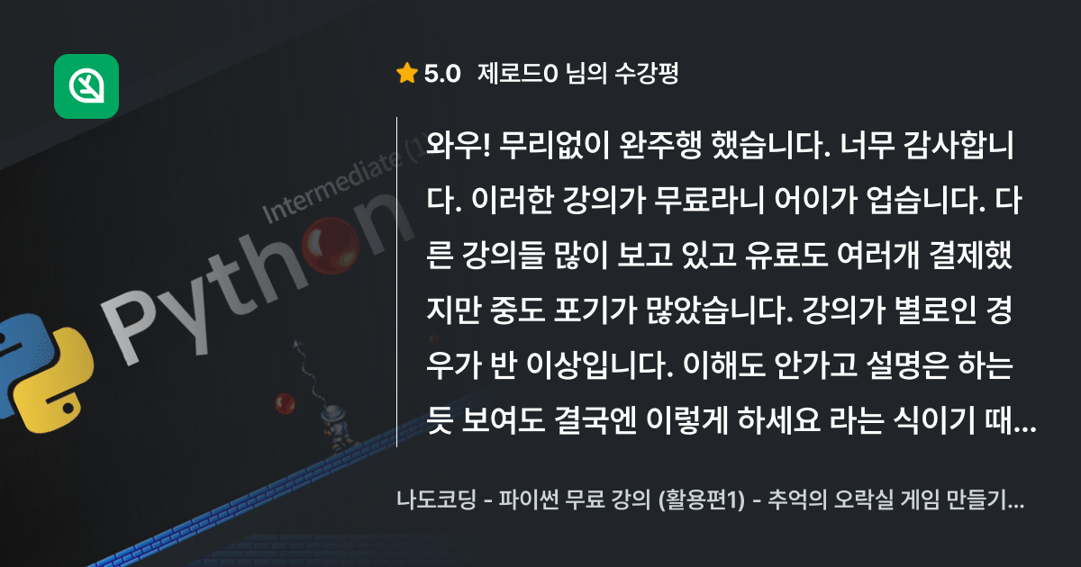 제로드0님의 생생한 수강평, 파이썬 무료 강의 (활용편1) - 추억의 오락실 ... - 인프런 | 수강평