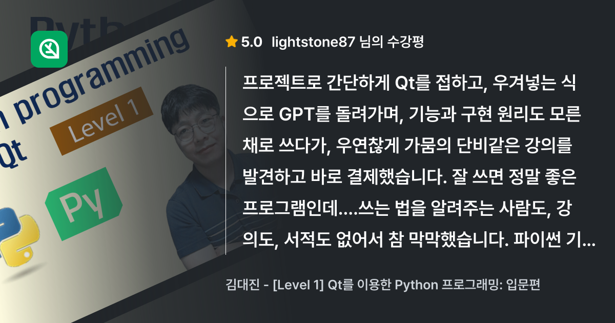 lightstone87님의 생생한 수강평, [Level 1] Qt를 이용한 P... - 인프런 | 수강평