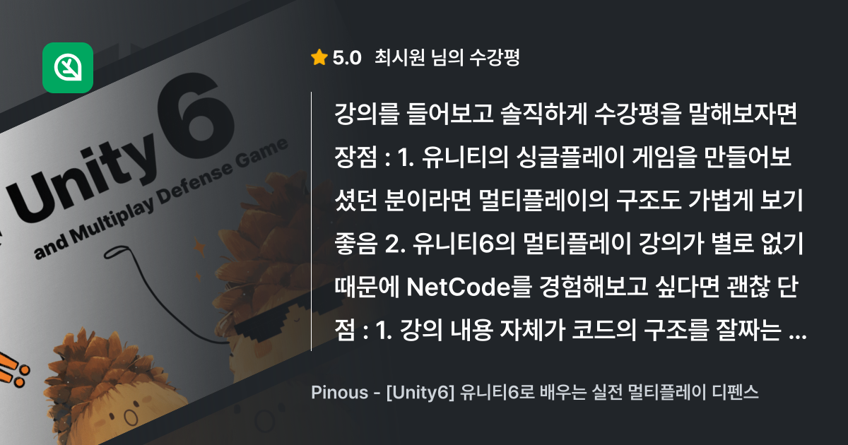 최시원님의 생생한 수강평, [Unity6] 유니티6로 배우는 실전 멀티플레이 ... - 인프런 | 수강평
