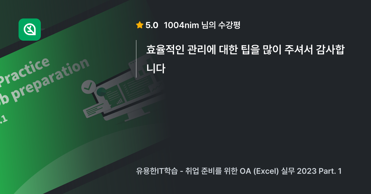1004nim님의 생생한 수강평, 취업 준비를 위한 OA (Excel) 실무 ... - 인프런 | 수강평