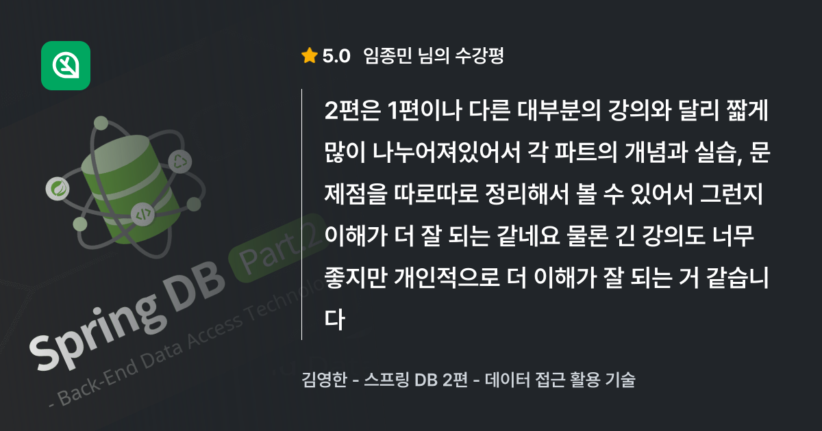 임종민님의 생생한 수강평, 스프링 DB 2편 - 데이터 접근 활용 기술 - 인프런 | 수강평