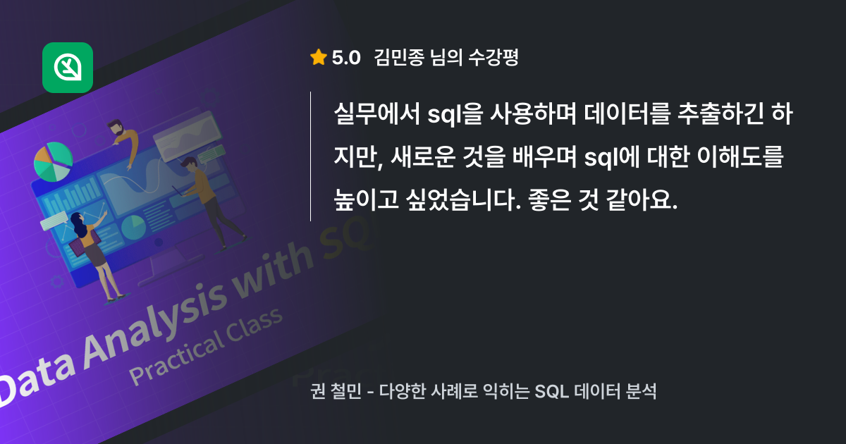 김민종님의 생생한 수강평, 다양한 사례로 익히는 SQL 데이터 분석 - 인프런 | 수강평