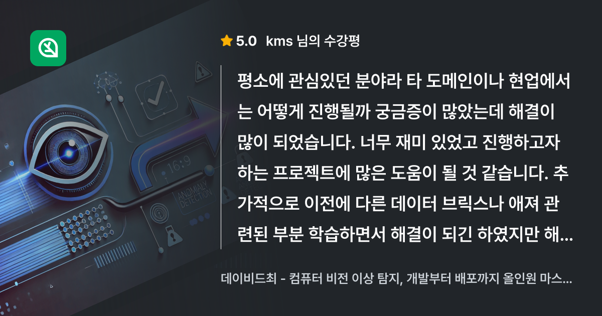 kms님의 생생한 수강평, 컴퓨터 비전 이상 탐지, 개발부터 배포까지 올인원 ... - 인프런 | 수강평
