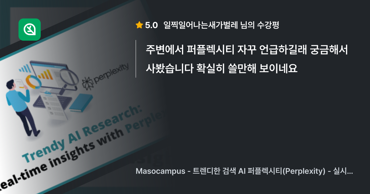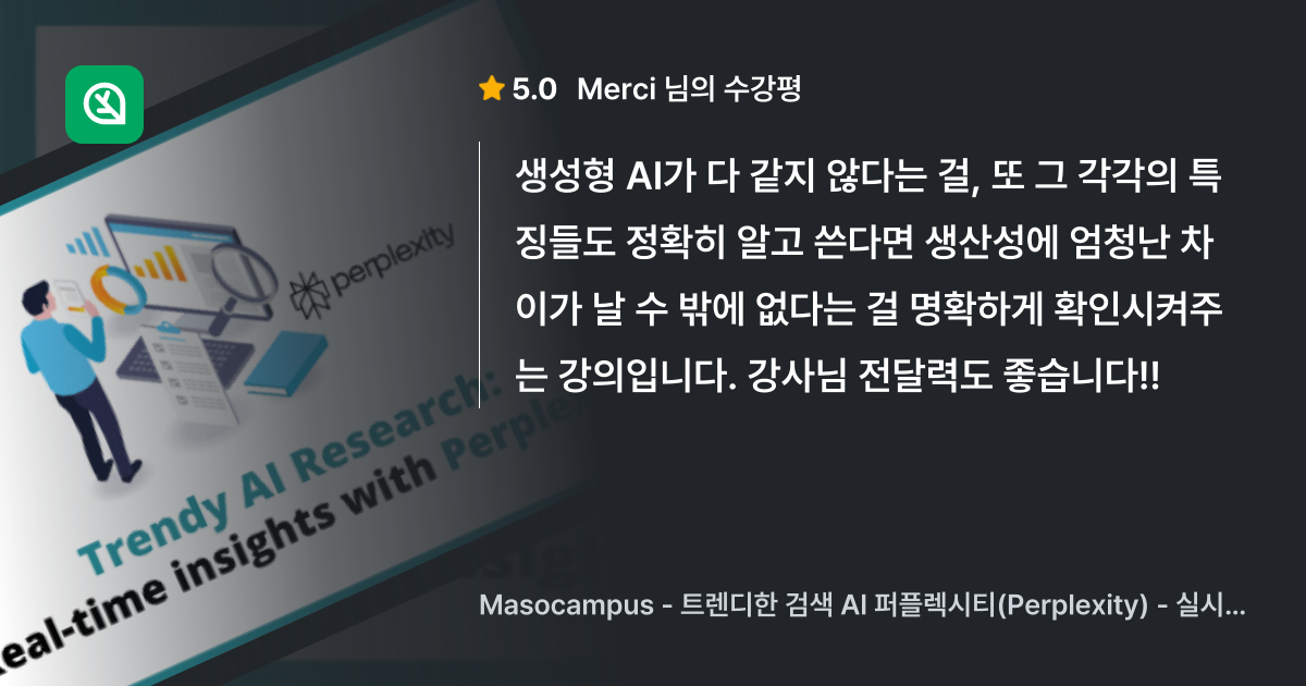 Merci님의 생생한 수강평, 트렌디한 검색 AI 퍼플렉시티(Perplexit... - 인프런 | 수강평