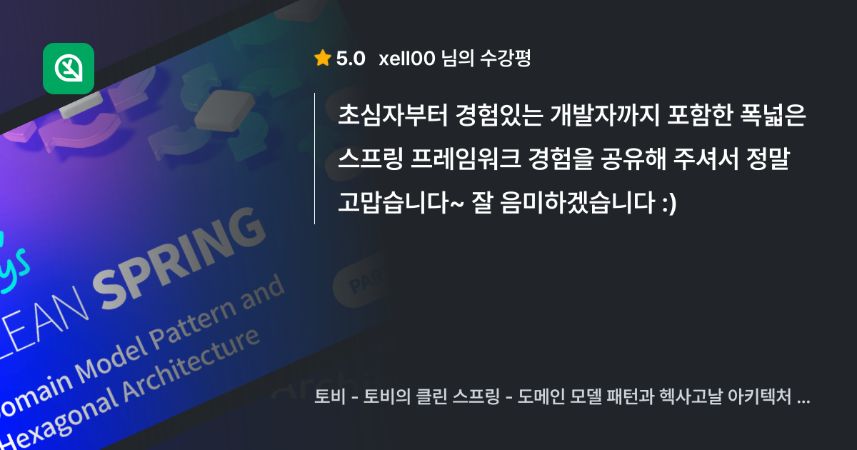 xell00님의 생생한 수강평, 토비의 클린 스프링 - 도메인 모델 패턴과 헥... - 인프런 | 수강평