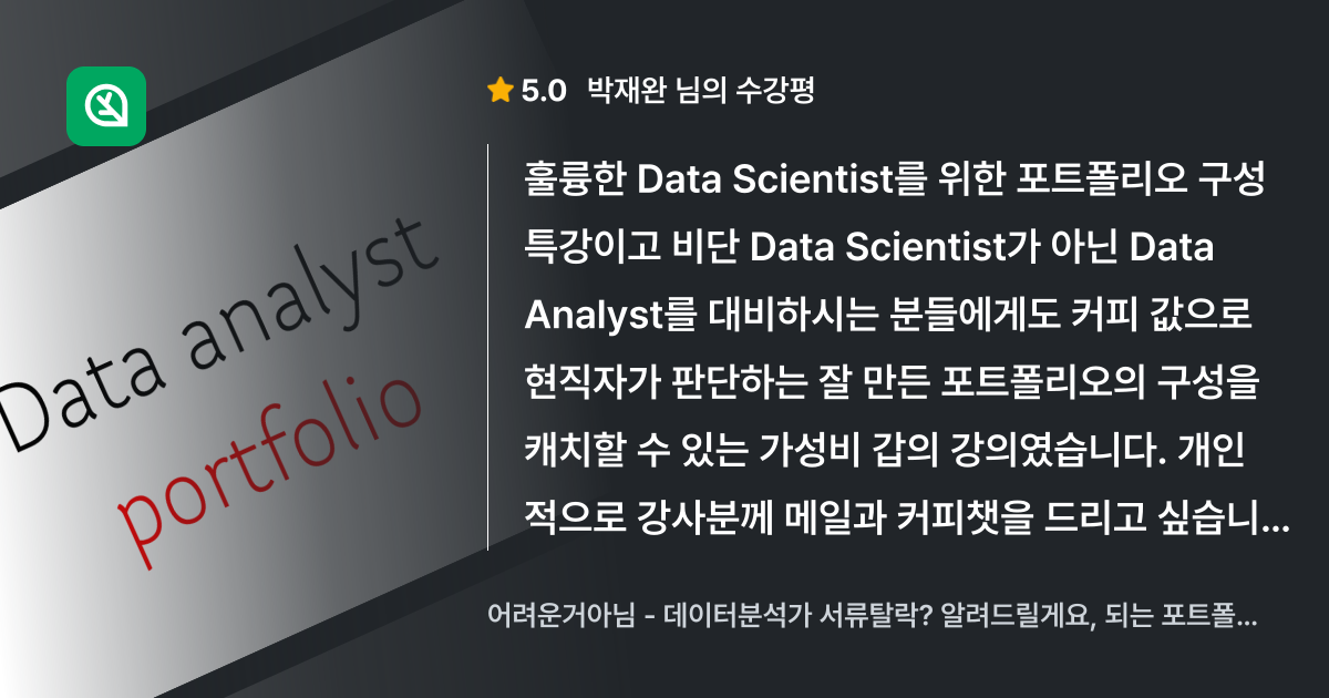 박재완님의 생생한 수강평, 데이터분석가 서류탈락? 알려드릴게요, 되는 포트폴리... - 인프런 | 수강평
