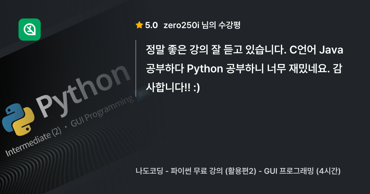 zero250i님의 생생한 수강평, 파이썬 무료 강의 (활용편2) - GUI ... - 인프런 | 수강평