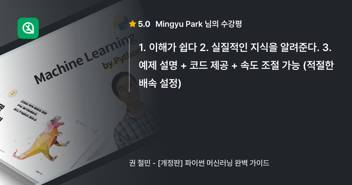 Mingyu Park님의 생생한 수강평, [개정판] 파이썬 머신러닝 완벽 가이... - 인프런 | 수강평