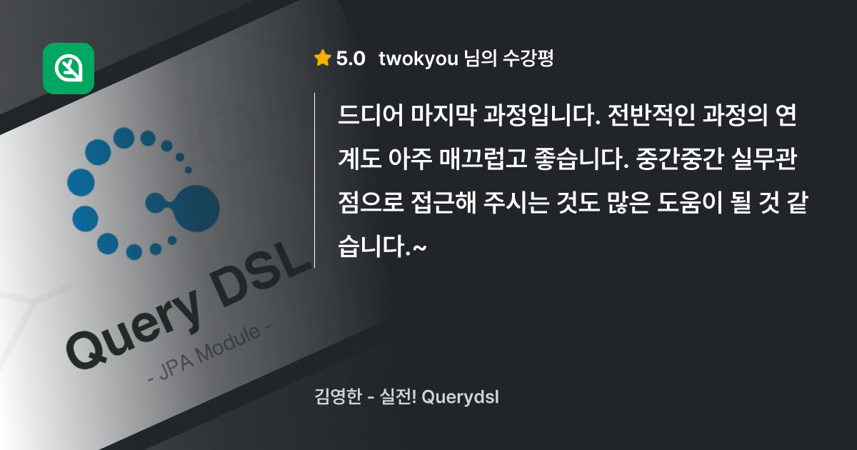 twokyou님의 생생한 수강평, 실전! Querydsl - 인프런 | 수강평