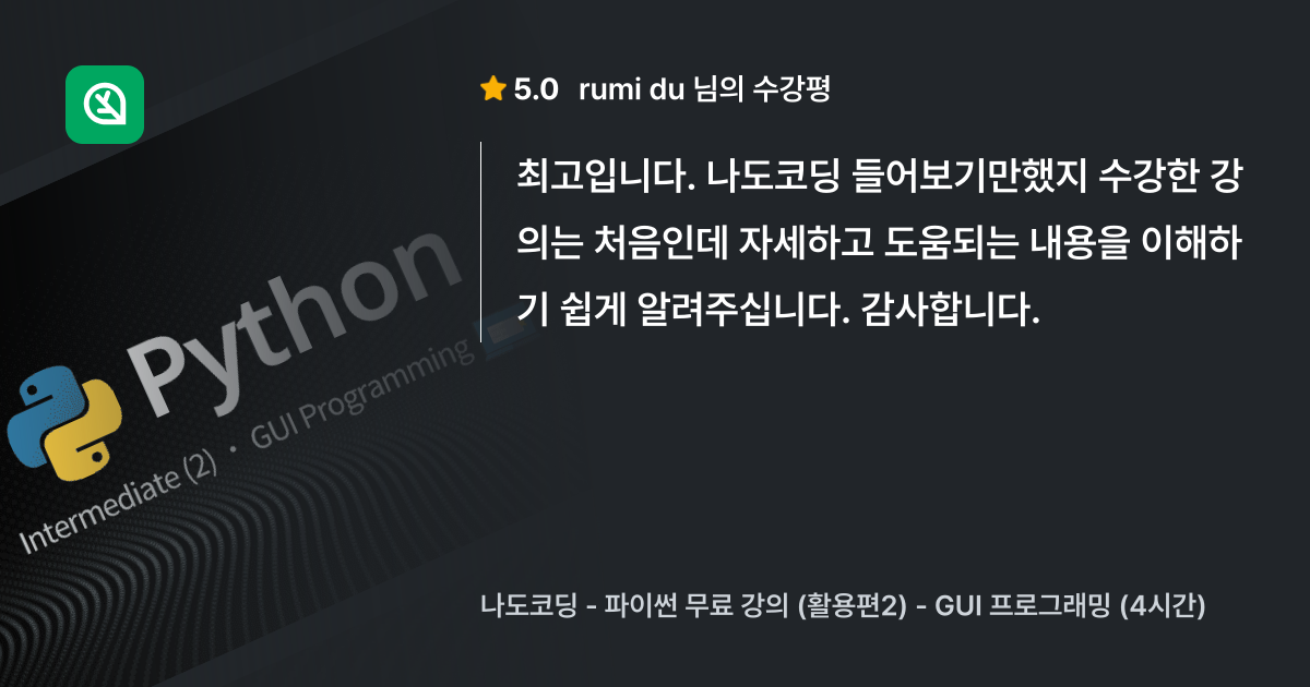 rumi du님의 생생한 수강평, 파이썬 무료 강의 (활용편2) - GUI 프... - 인프런 | 수강평