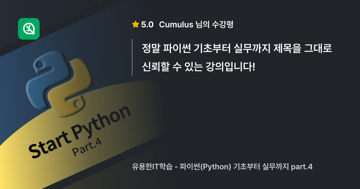 Cumulus님의 생생한 수강평, 파이썬(Python) 기초부터 실무까지 pa... - 인프런 | 수강평