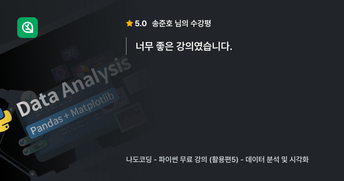 송준호님의 생생한 수강평, 파이썬 무료 강의 (활용편5) - 데이터 분석 및 ... - 인프런 | 수강평