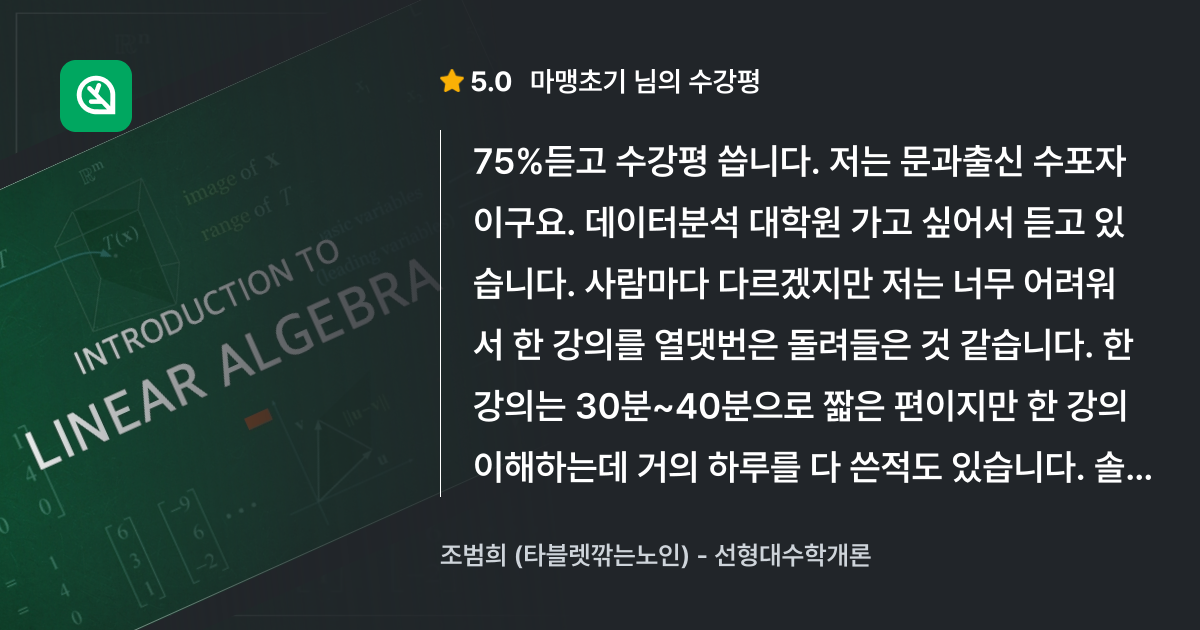 마맹초기님의 생생한 수강평, 선형대수학개론 - 인프런 | 수강평
