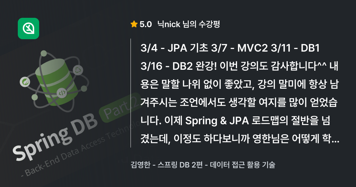 닉nick님의 생생한 수강평, 스프링 DB 2편 - 데이터 접근 활용 기술 강... - 인프런 | 수강평