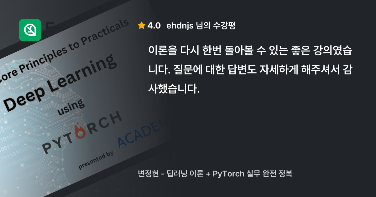 ehdnjs님의 생생한 수강평, 딥러닝 이론 + PyTorch 실무 완전 정복... - 인프런 | 수강평