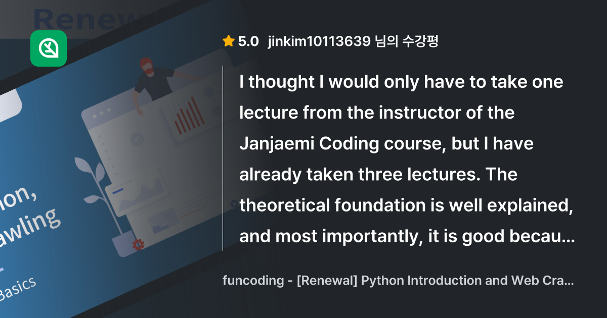jinkim1011님의 생생한 수강평, 파이썬입문과 크롤링기초 부트캠프 [파이... - 인프런 | 수강평