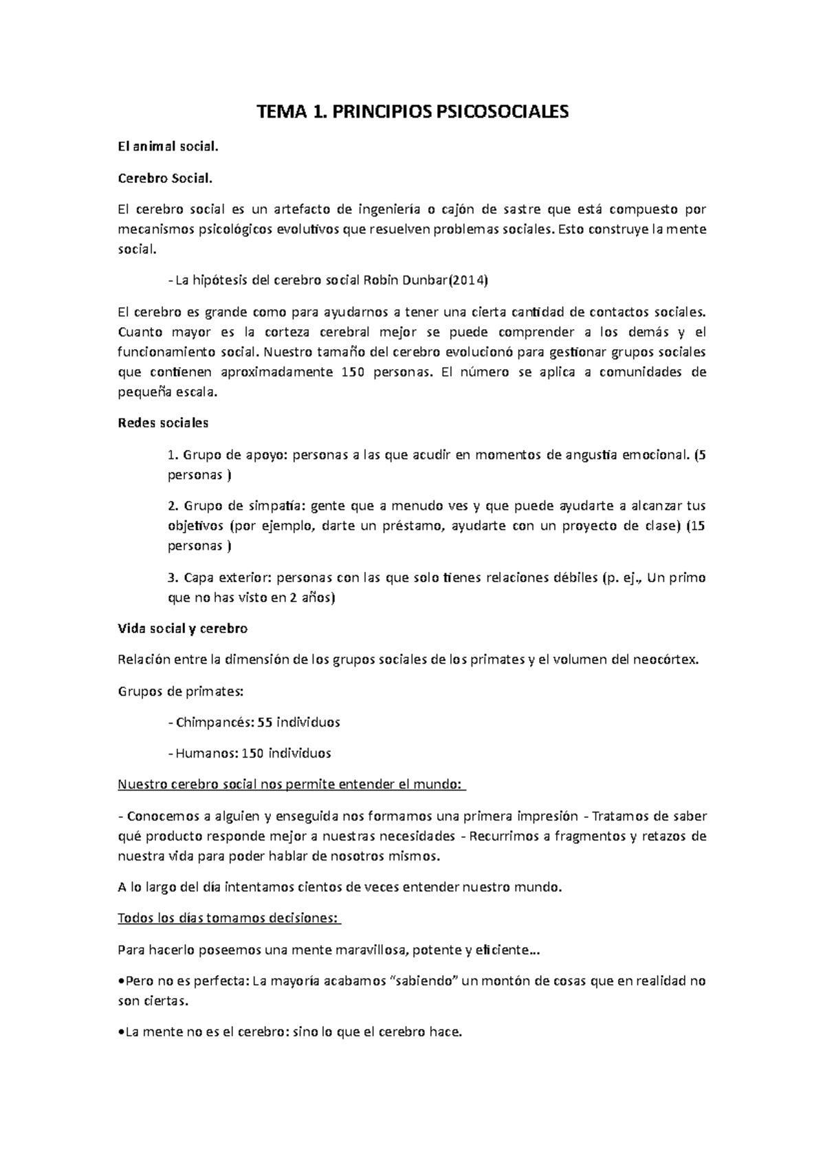 TEMA 1 - Apuntes 1 - TEMA 1. PRINCIPIOS PSICOSOCIALES El animal social ...