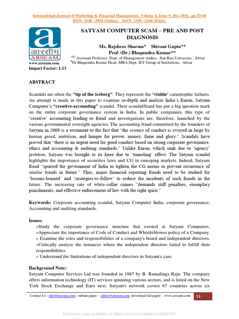Satyam Computer Scam - Pre and Post Diagnosis | Download Free PDF ...