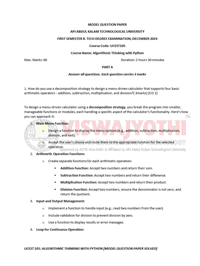 UCEST 105 - Model Question Paper and Solutions for Algorithmic Thinking ...