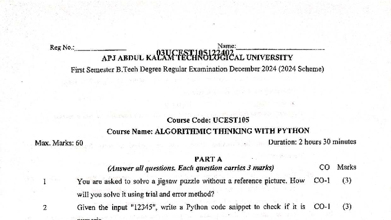 KTU Algorithmic Thinking Exam Paper 2024 | PDF | Algorithms | Matrix ...