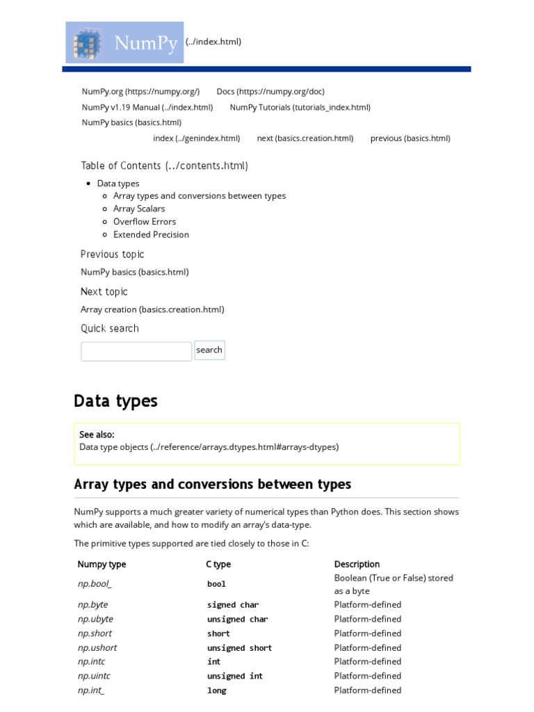 Data Types - NumPy v1.19 Manual | PDF | Integer (Computer Science) | 64 ...