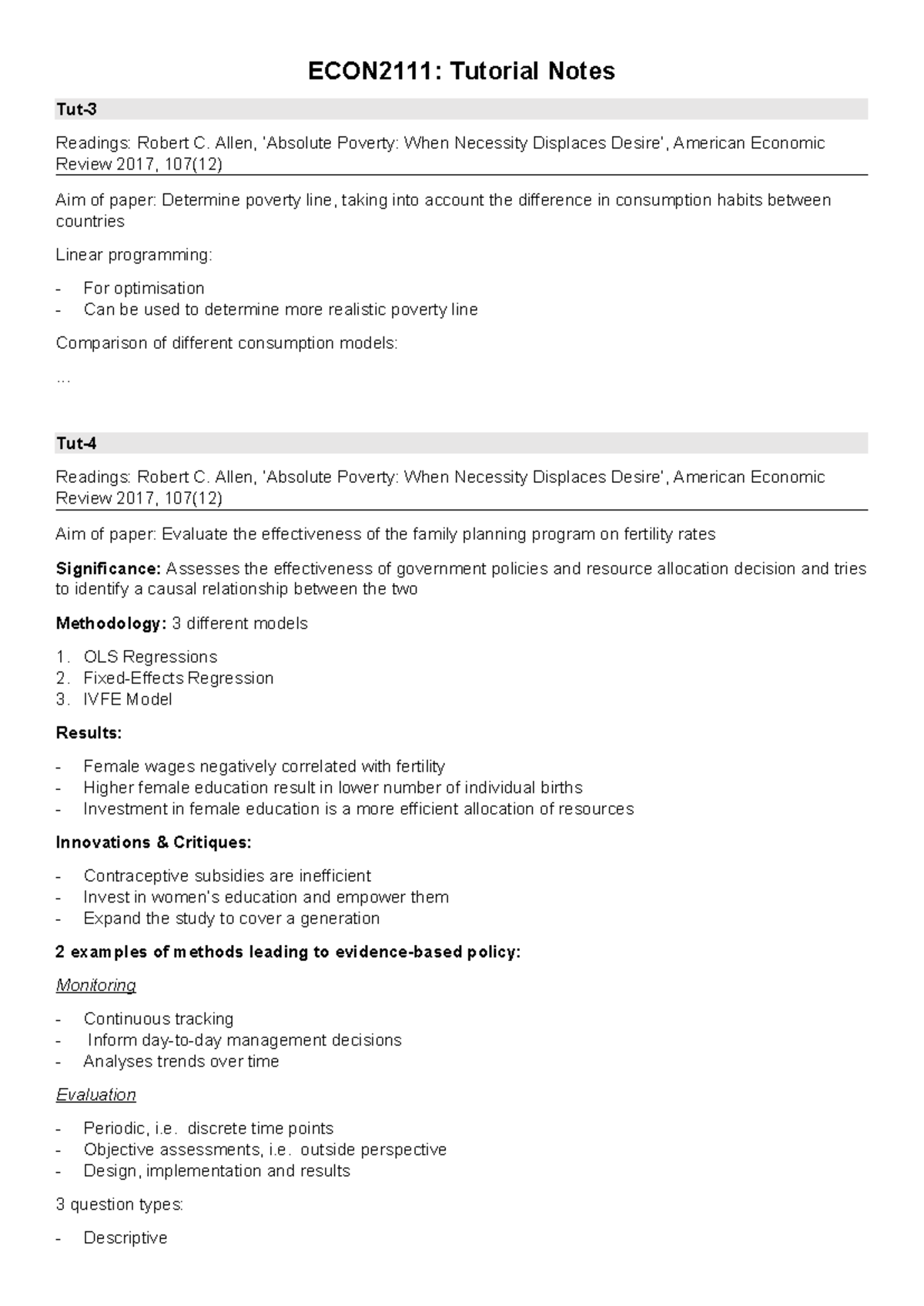 ECON2111 - Tutorial Notes - ECON2111: Tutorial Notes Tut- Readings ...