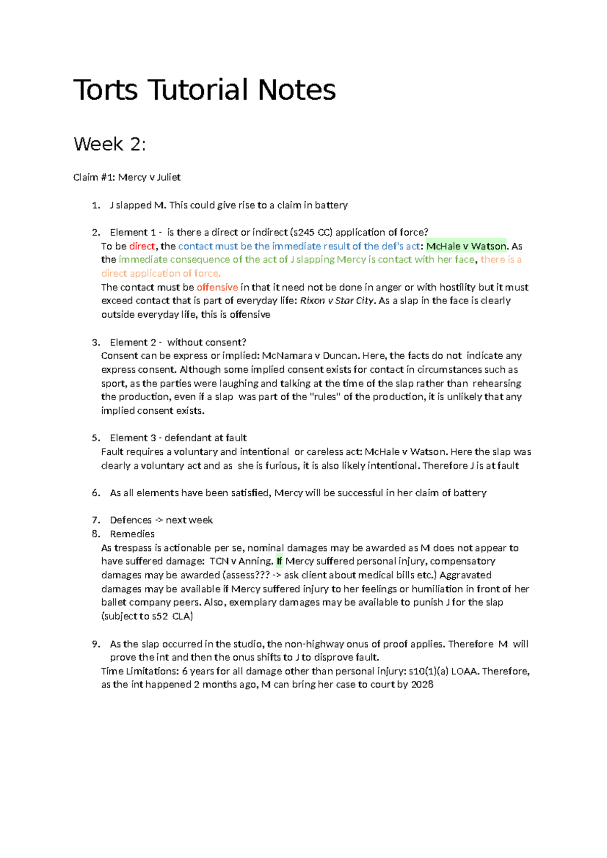 Torts Tutorial Notes - Torts Tutorial Notes Week 2: Claim #1: Mercy v ...
