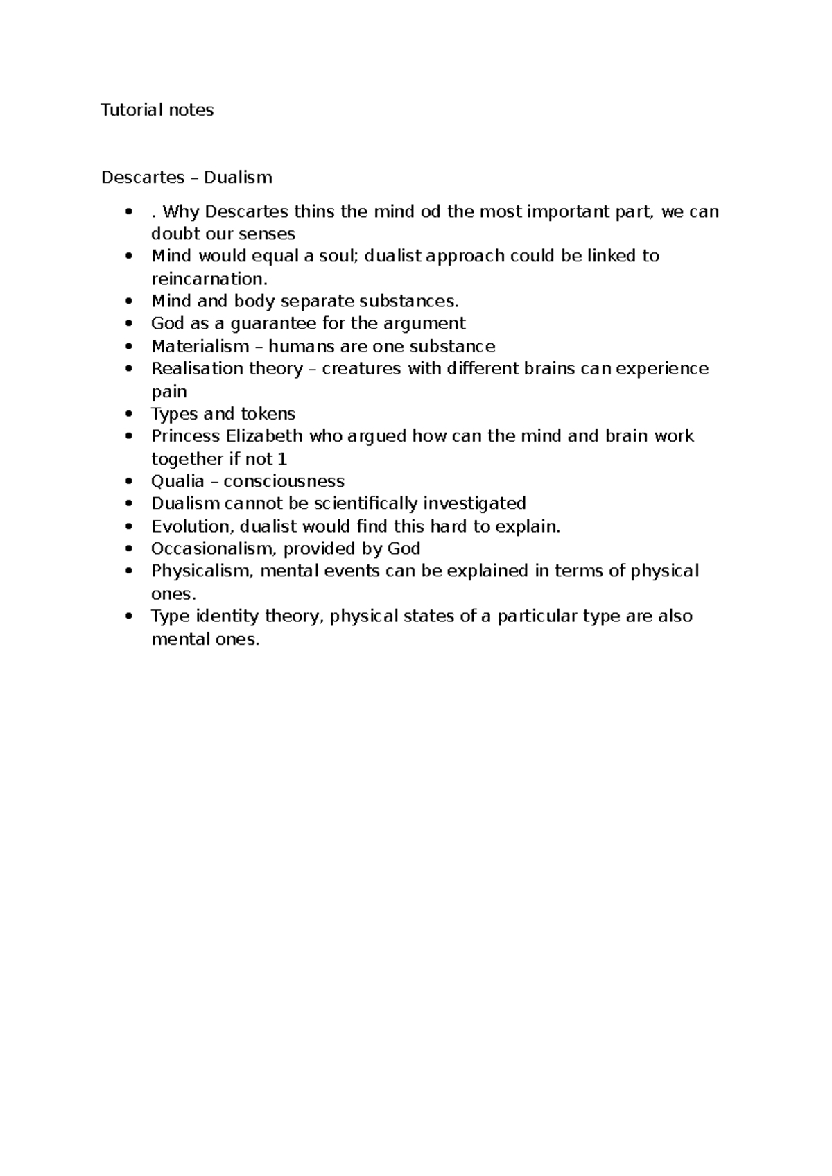 Tutorial notes - Tutorial notes Descartes – Dualism . Why Descartes ...