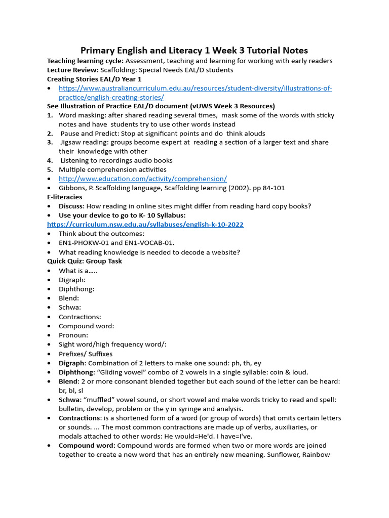 Primary English and Literacy 1 Week 3 Tutorial Notes | PDF | Word ...
