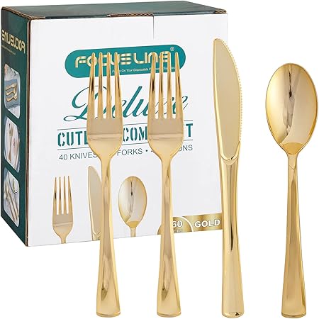 MATANA - 180 Elegant Gold Plastic Cutlery Set - 60 Knives, 60 Forks, 60 ...
