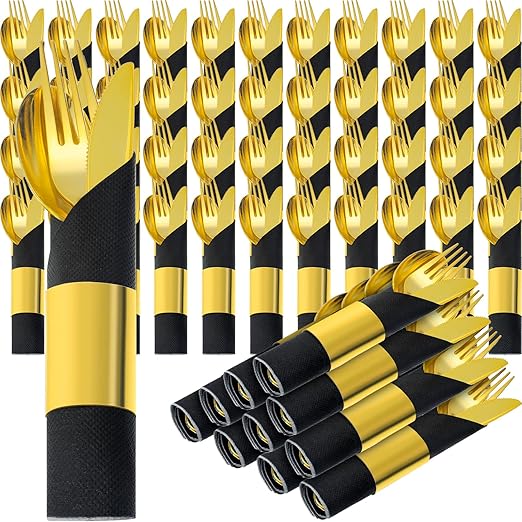 Amazon.com: Sabary 150 Gold Plastic Silverware Pre Rolled Black Napkins ...