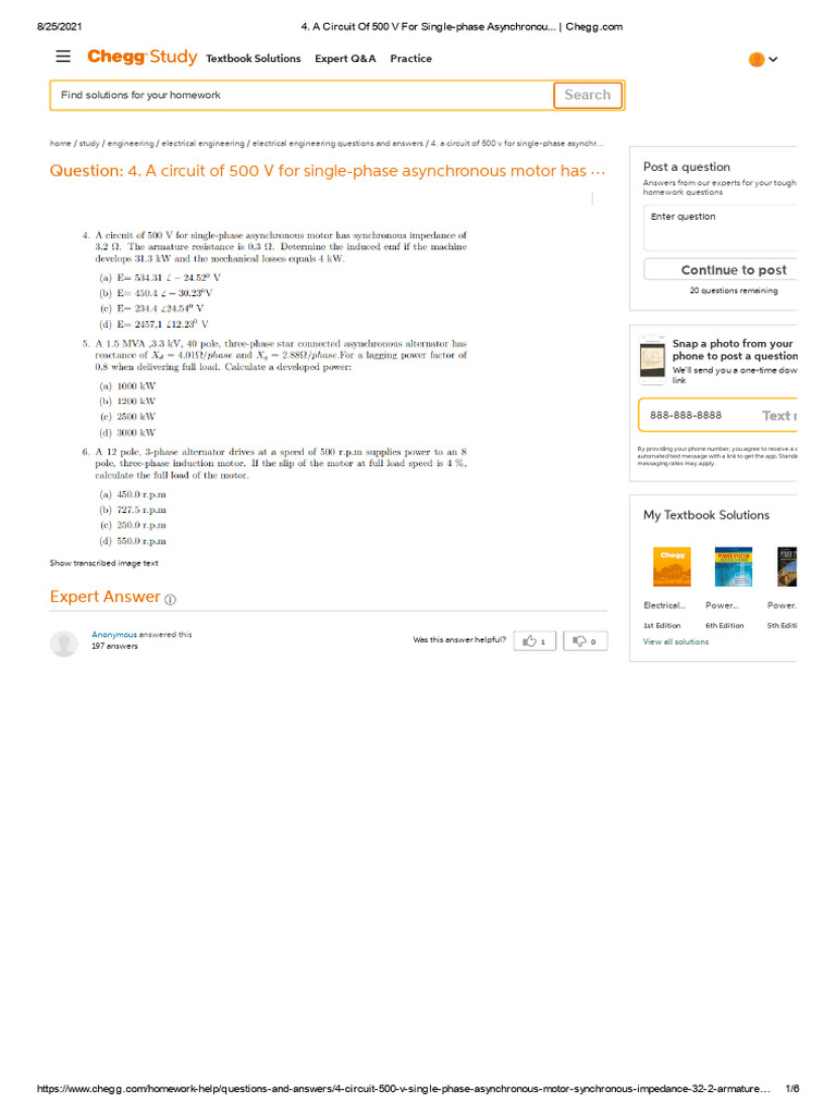 Q4_5_6_A Circuit of 500 v for Single-phase Asynchronou... _ Chegg.com ...