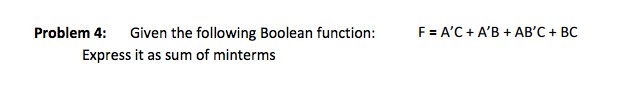 Solved Given the following Boolean function: F = A'C + A'B | Chegg.com