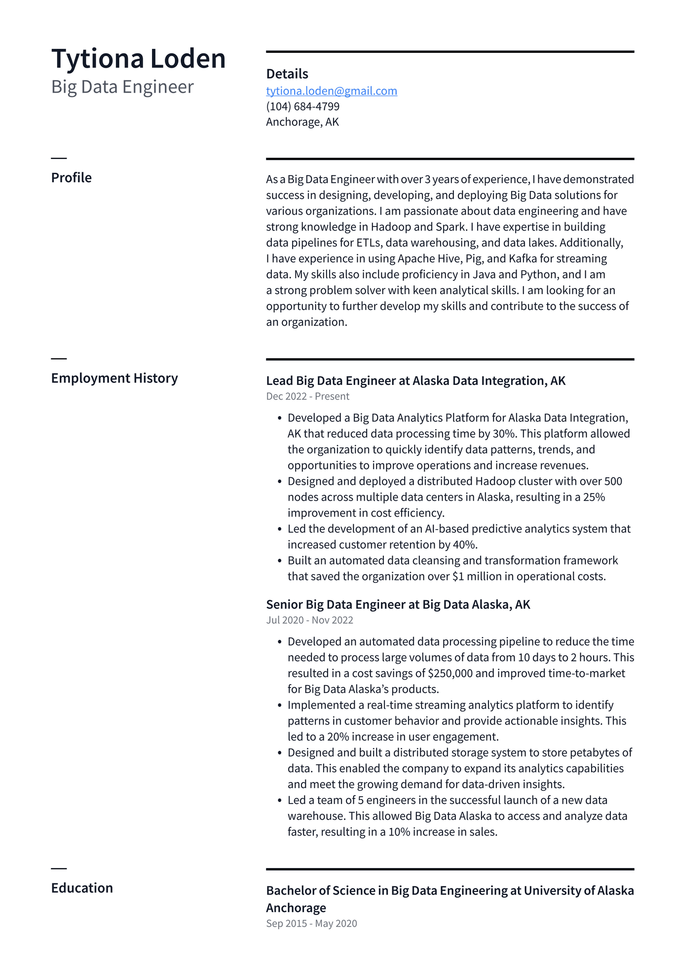 Big Data Engineer Resume (CV) Example and Writing Guide