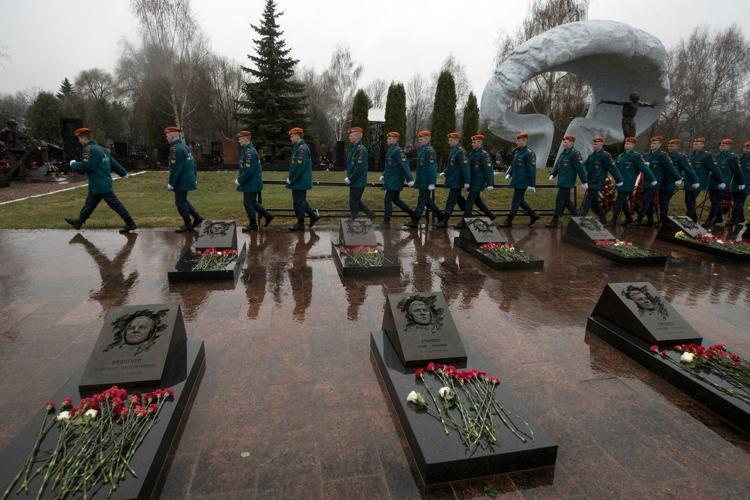 Based on this image's title: “AP Was There: Early Chernobyl victims buried in Moscow cemetery | World ...”