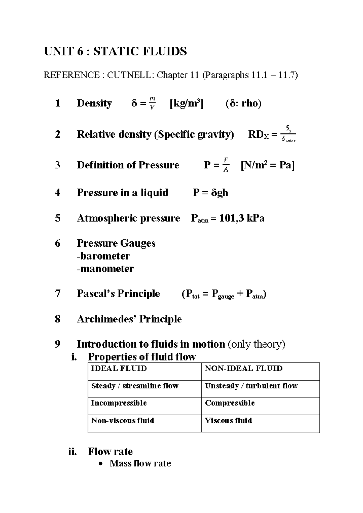 UNIT 6: Static Fluids Overview - Cutnell Ch. 11 Notes - Studocu