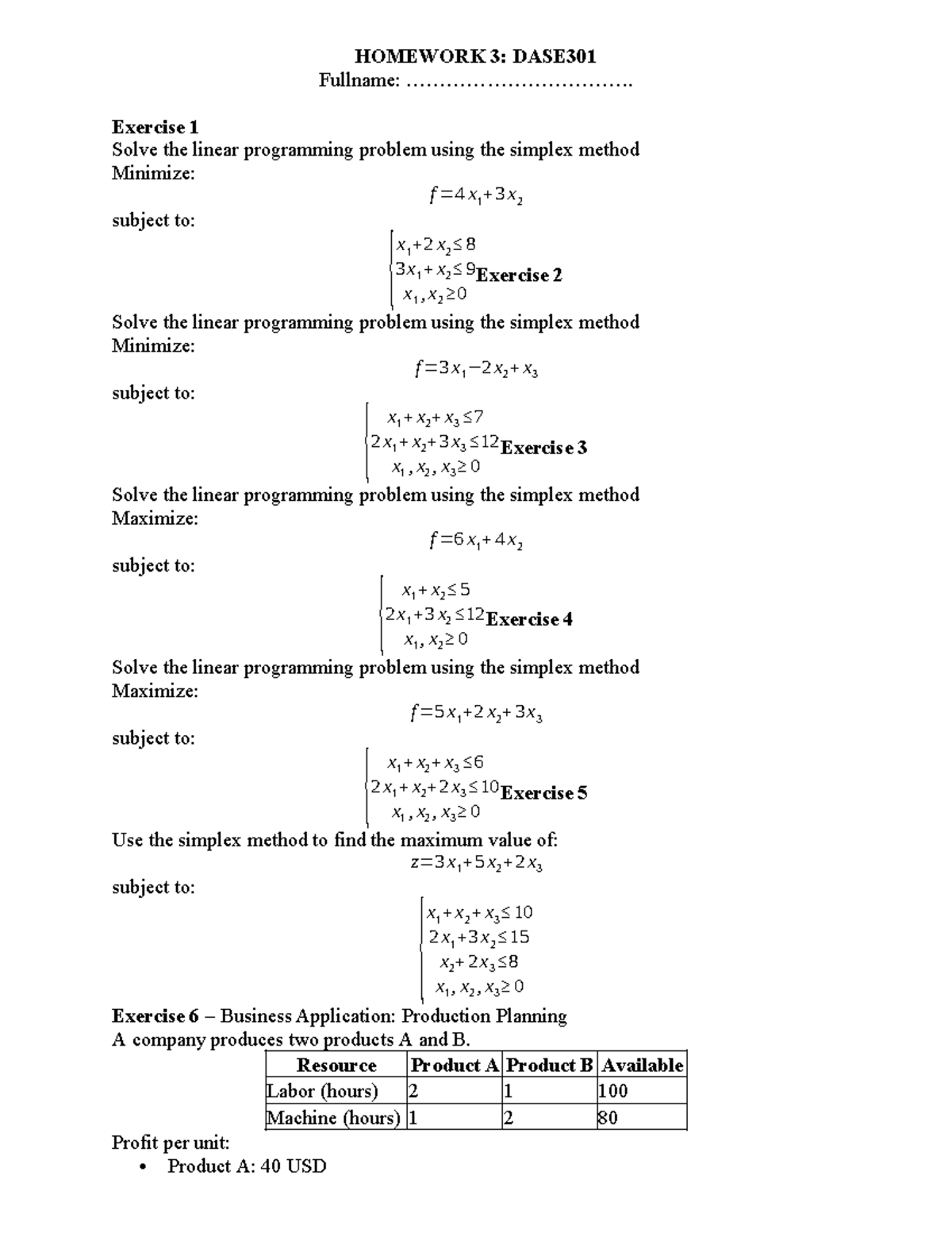 Homework 3: DASE301 Linear Programming Exercises Using Simplex Method ...