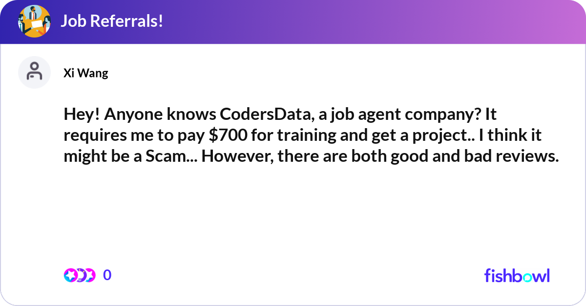 Hey! Anyone knows CodersData, a job agent company?... | Fishbowl